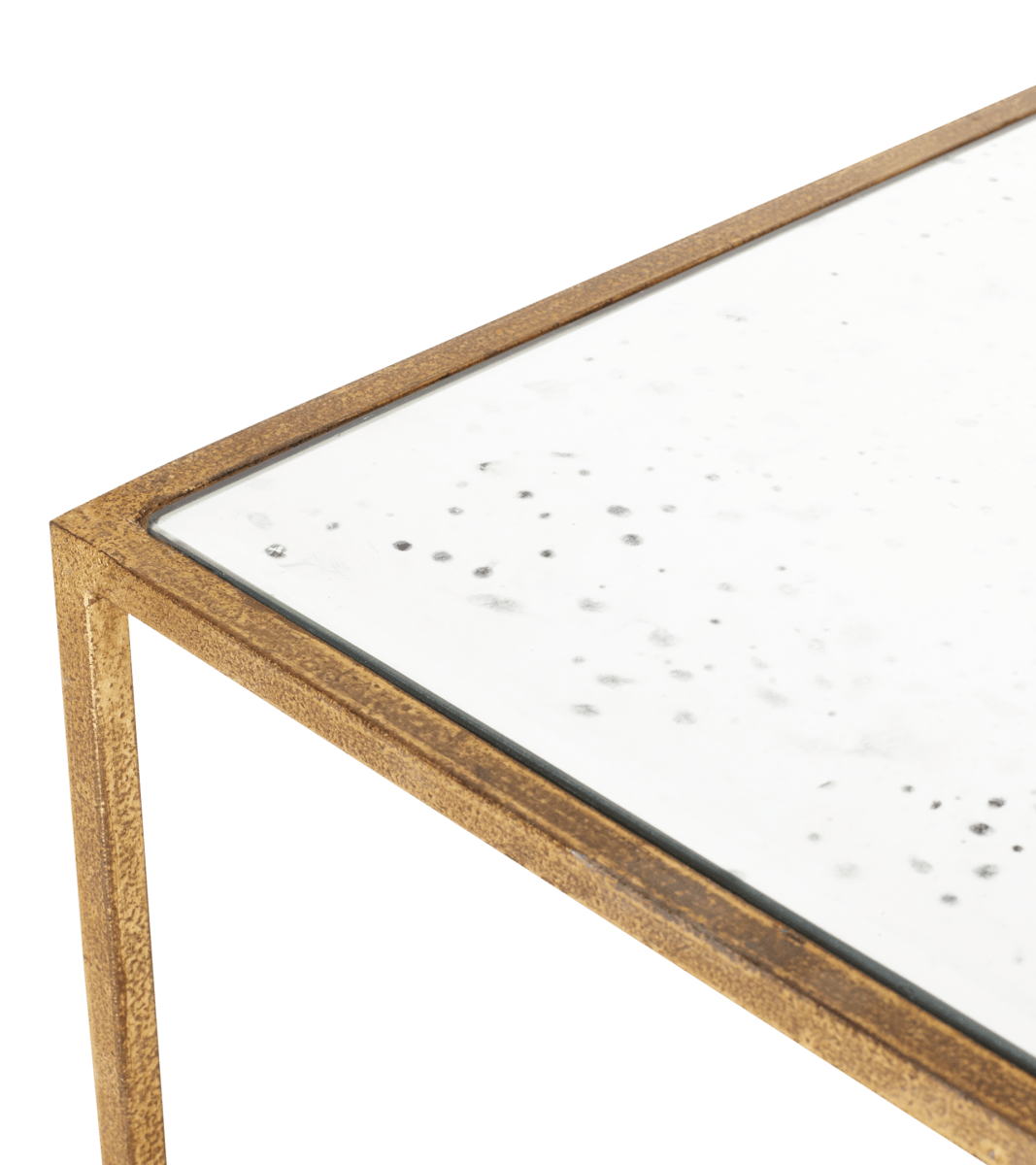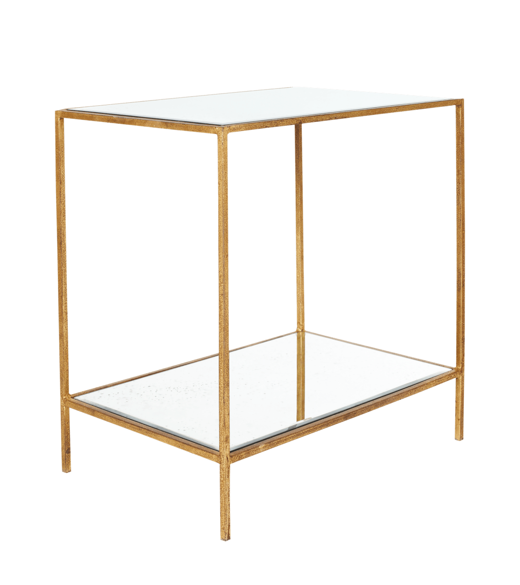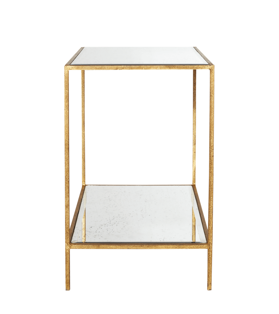 This useful side table features two shelves made of antiqued mirror glass set within a bronze finished, distressed metal frame. The opulent design married with extensive surface space, make this side table both beautiful and practical.